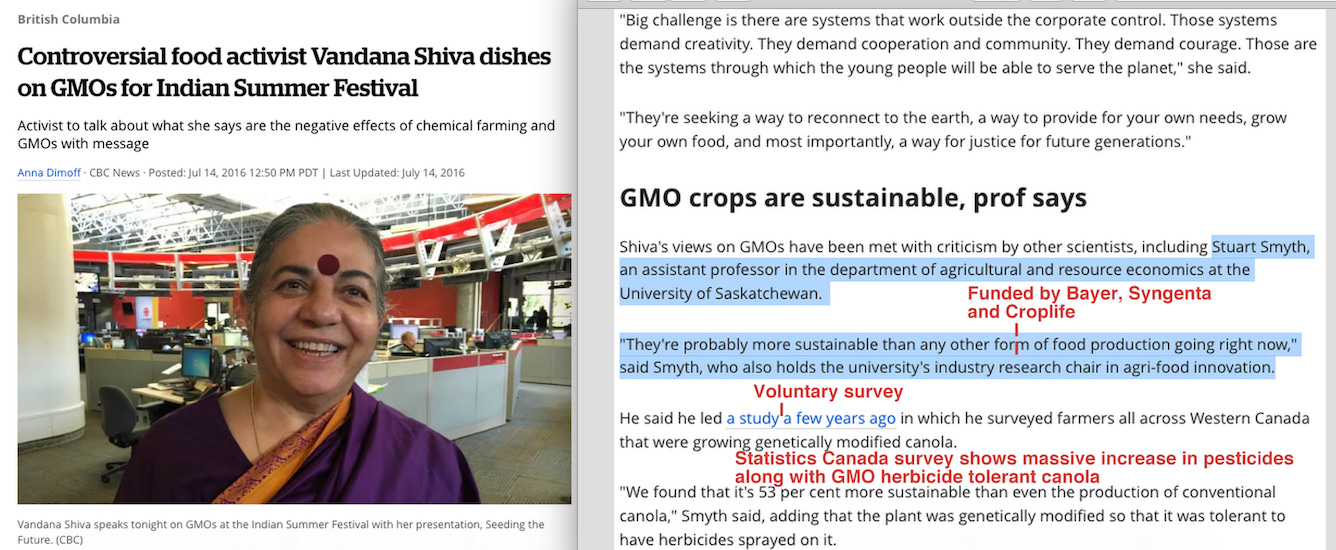 Dr. Stuart Smyth is one of the CBC’s go-to guys on agricultural topics and GMO’s. Mr. Smyth may technically work for the University of Saskatchewan but his research chair is funded by some of the largest pesticide and GMO seed companies on the planet- Bayer, Syngenta, and the pesticide industry lobby group Crop-Life. Of course the CBC has never disclosed the specifics of that, even when they use Smyth to discredit GMO skeptics like Vandana Shiva (who in contrast to Smyth is described as a “controversial food activist” in the headline).